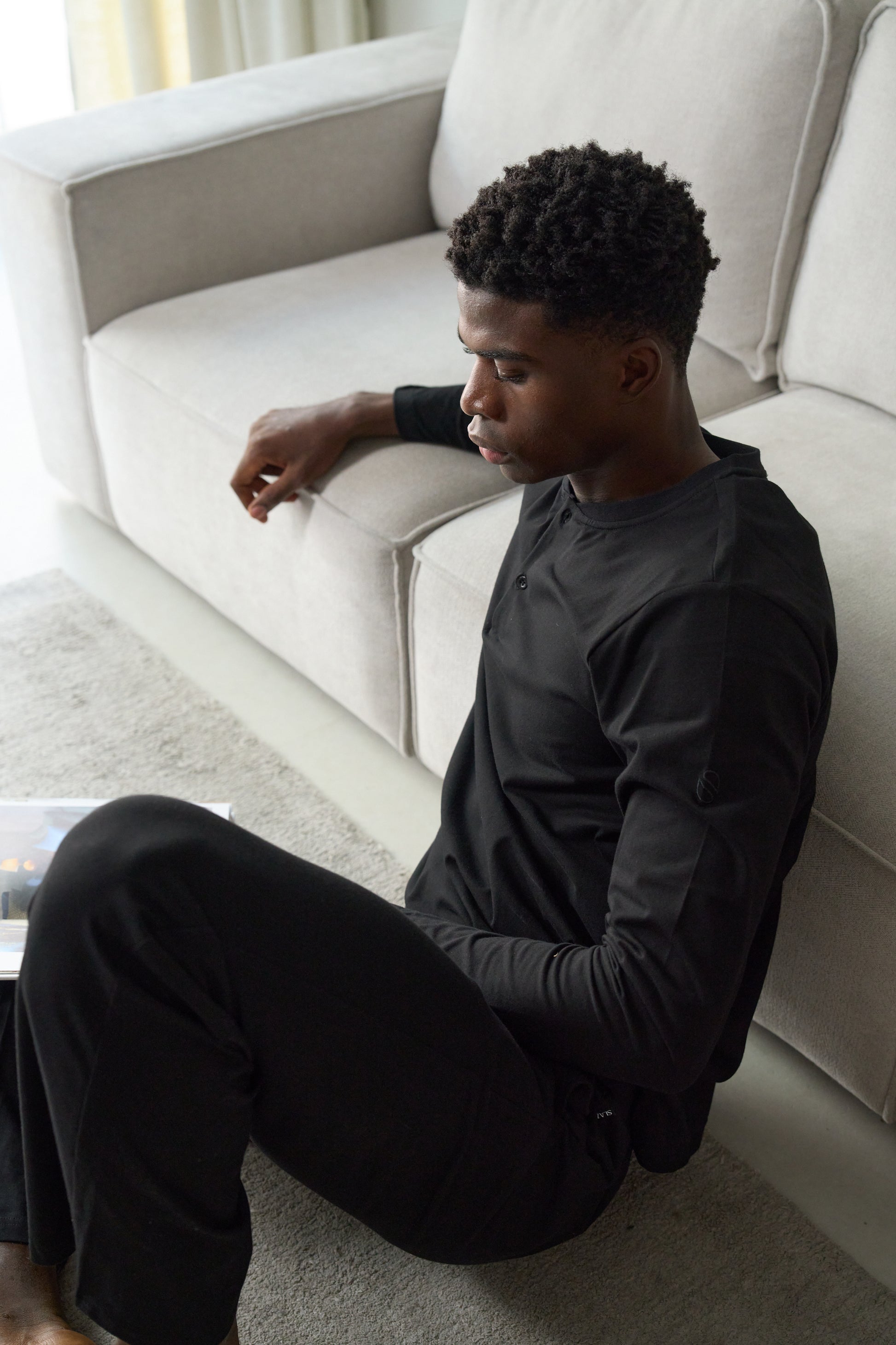 Ce haut de pyjama SLAZZ se distingue par sa coupe Henley élégante et son tissu French Terry doux et stretch. Pensé pour un confort exceptionnel, il épouse vos mouvements tout en maintenant une allure soignée. Son design épuré et ses détails discrets en font un haut polyvalent, parfait pour la maison, le télétravail ou une sortie décontractée. Disponible en coloris chocolat et noir, il apporte une note chaleureuse et contemporaine à votre vestiaire d’intérieur.
